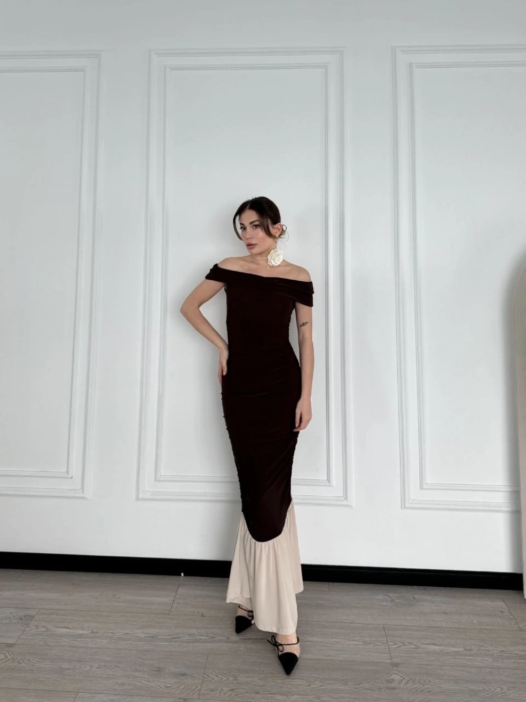 Kadın Striptiz Omuzlu Uzun Elbise - Kahve