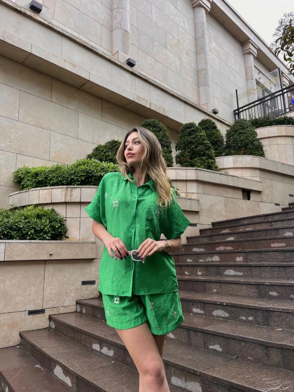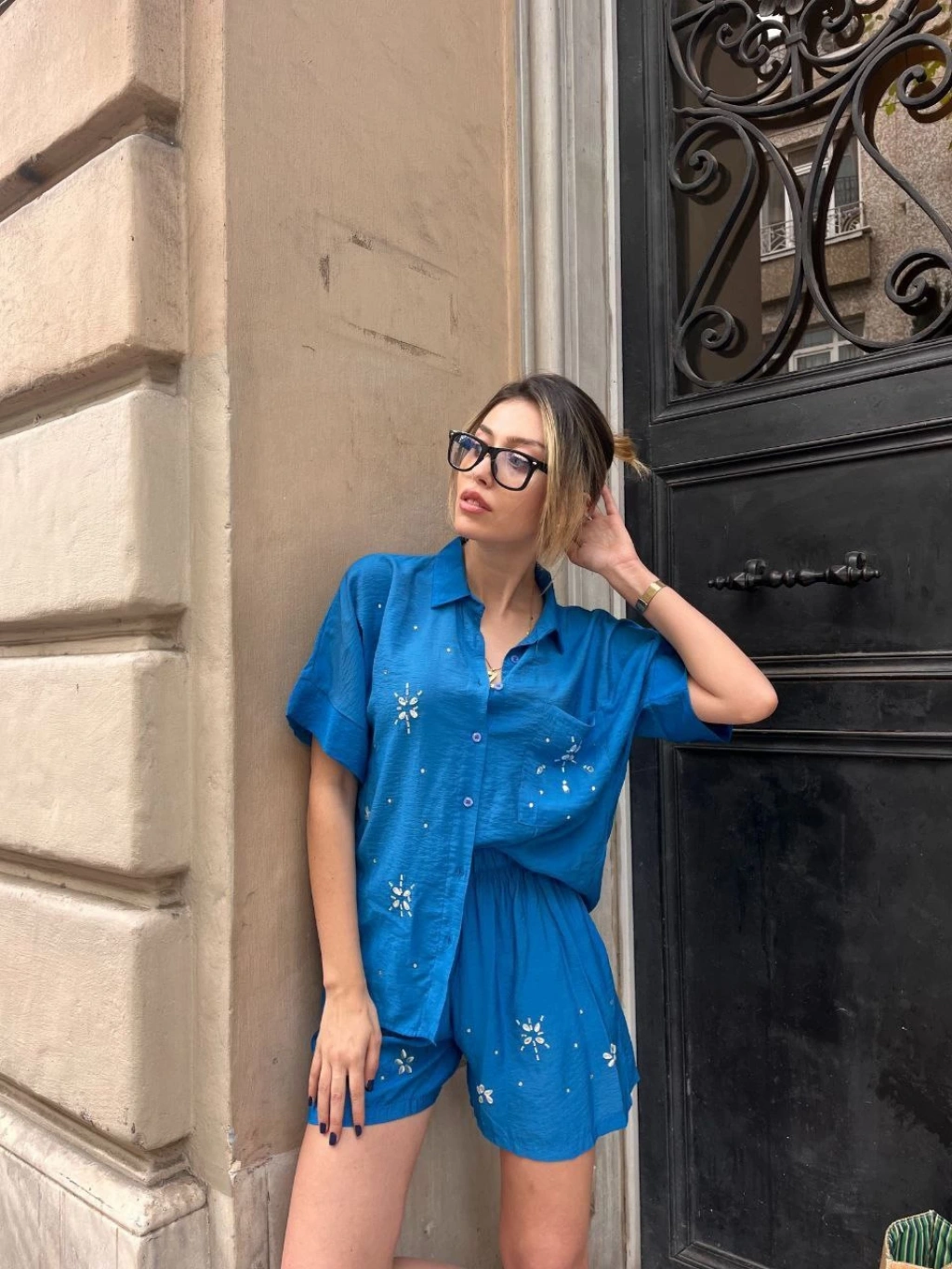 Toptan Bayan Tensel taşlı şort gömlek takım - 0001-001 240107